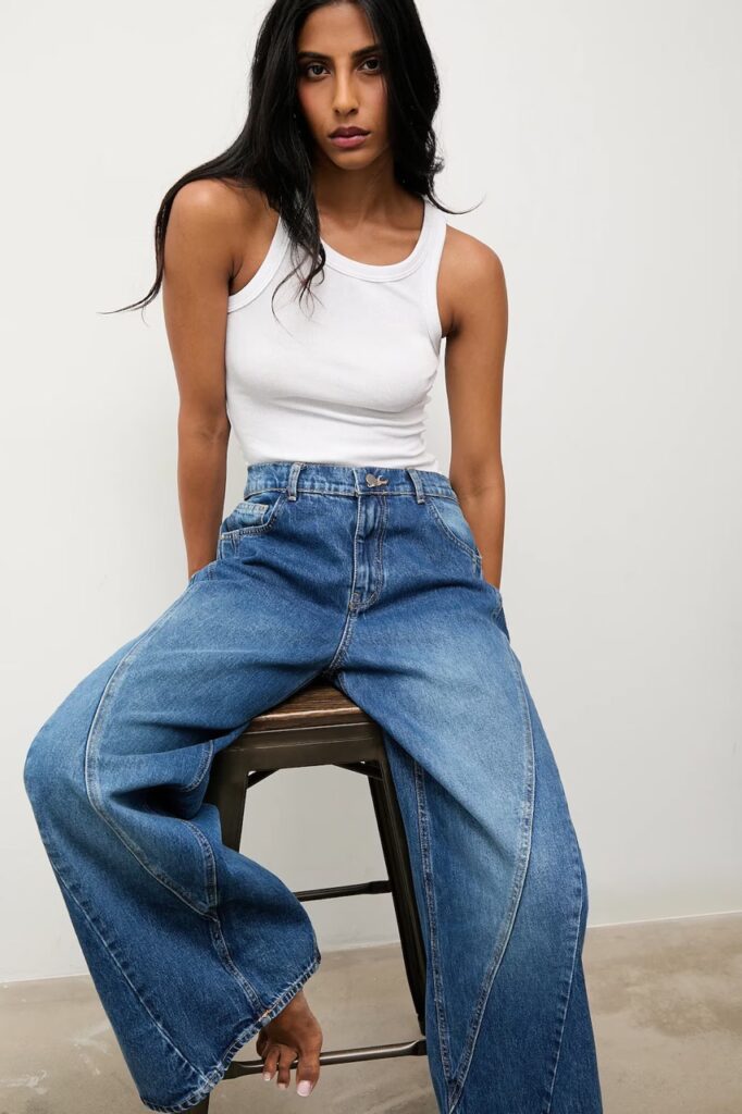 Kształt nogawki decyduje o finalnym charakterze jeansów. Od superdopasowanych rurek, które działają jak druga skóra, po dramatycznie szerokie dzwony – każdy fason inaczej rzeźbi nogi i balansuje proporcje całej sylwetki.