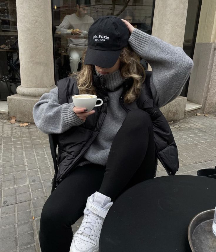 - Sportowy styl – legginsy z materiału technicznego zestaw z krótkim, dopasowanym swetrem i sneakersami. Idealne na aktywny dzień, pełen ruchu.