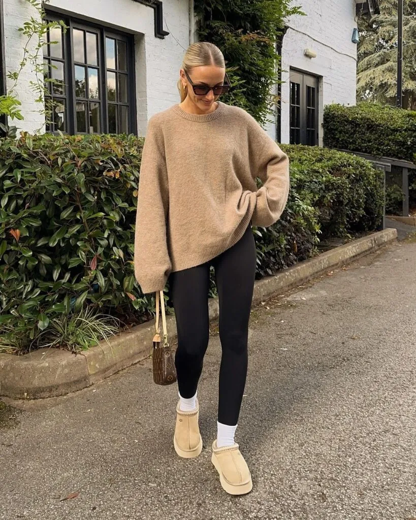 - Codzienny look – sweter oversize połączony z dopasowanymi legginsami i botkami to idealna propozycja na spacer po mieście.