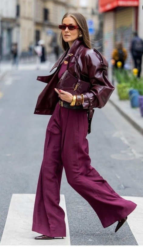 • Styl formalny – elegancka sukienka w odcieniu burgundu zestawiona z matowym płaszczem i błyszczącą torebką. Kontrast między matowym a błyszczącym materiałem nadaje całości klasy.
