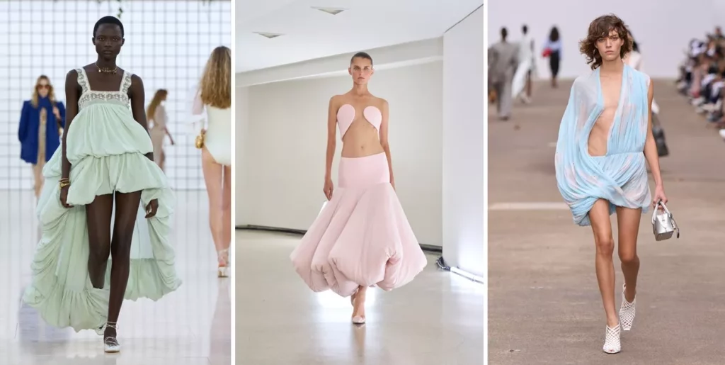 - Falbany i drapowania – Dodają objętości, co skutkuje bardziej kobiecą sylwetką.